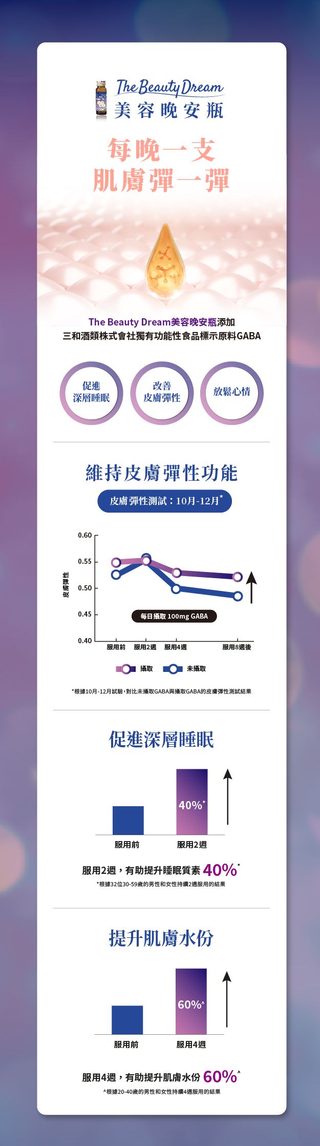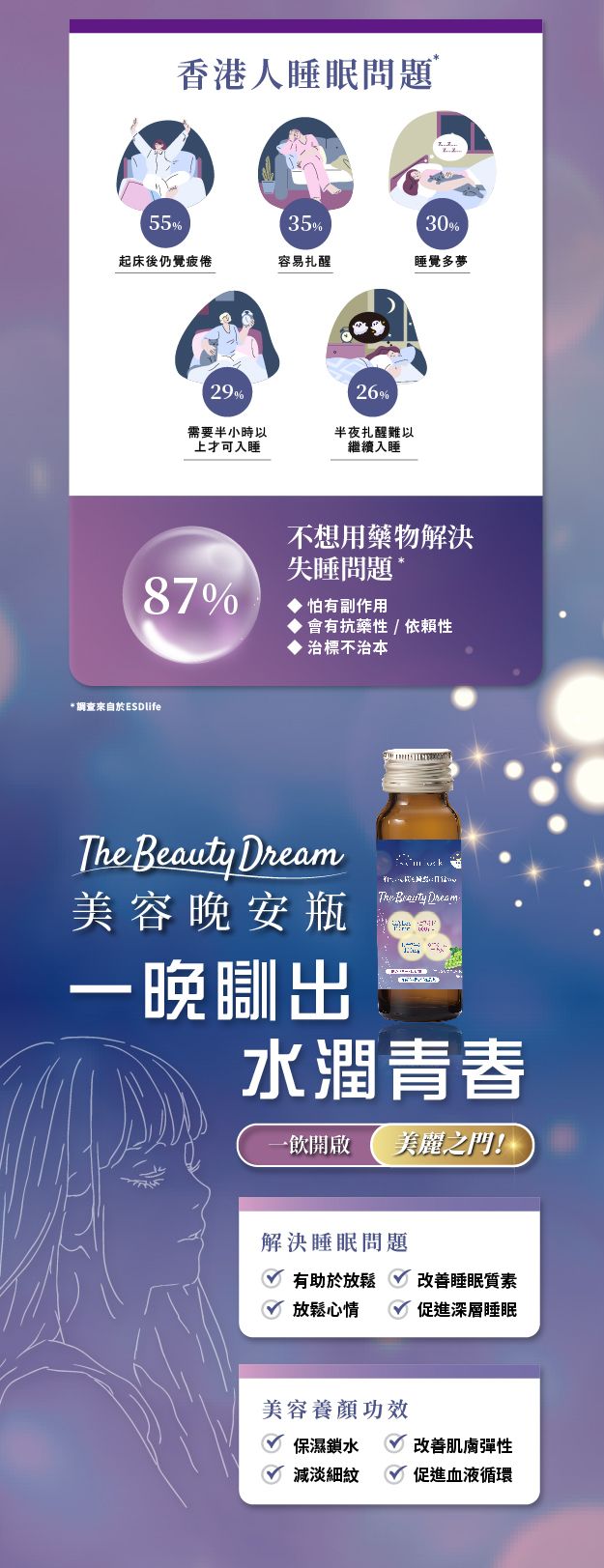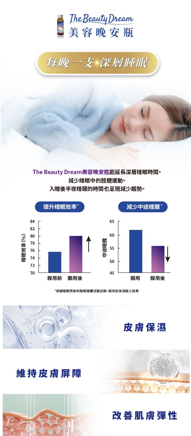 建議每天睡前半小時飲用一支。 可以改善睡眠,促進深層睡眠長度,並令肌膚鎖緊水分,促進膠原蛋白生成。 在睡覺時都比人美先一步